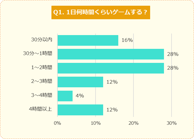 Q1.1日何時間くらいゲームする?30分~1時間、1時間~2時間がほとんど同じでした!