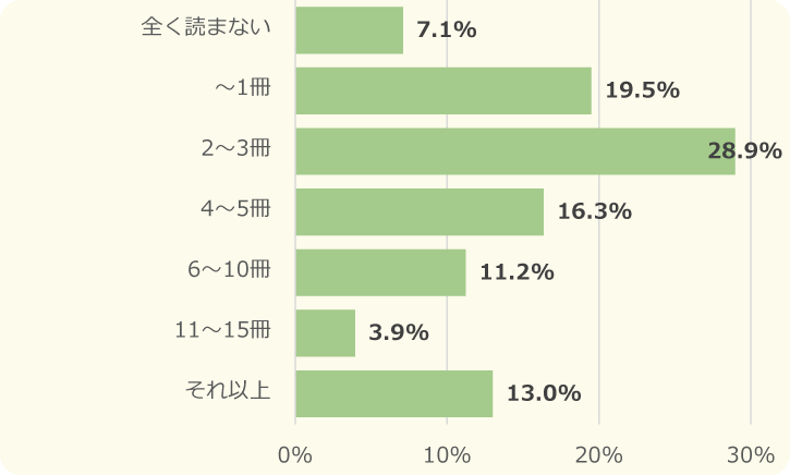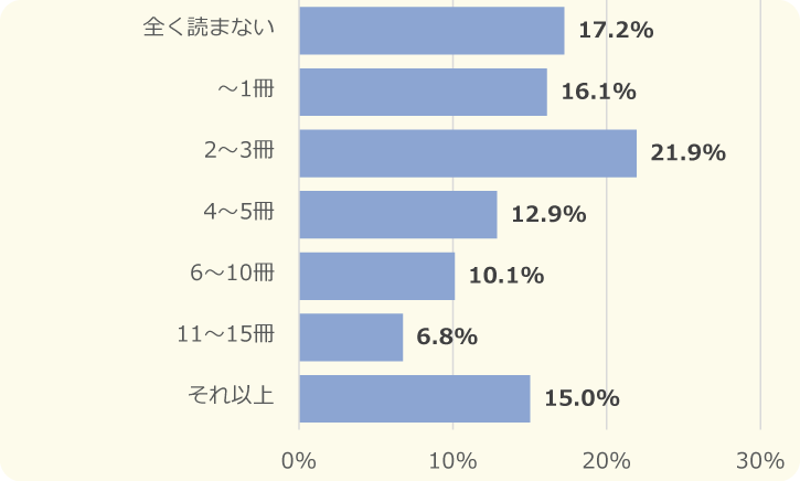 小学生の25%以上が、1カ月に「16冊以上」の本を読んでいることがわかりました!一方で、中学生の1番多かった回答は「2~3冊」だったよ。中学生になると勉強や部活でいそがしくなるのかもしれないね。