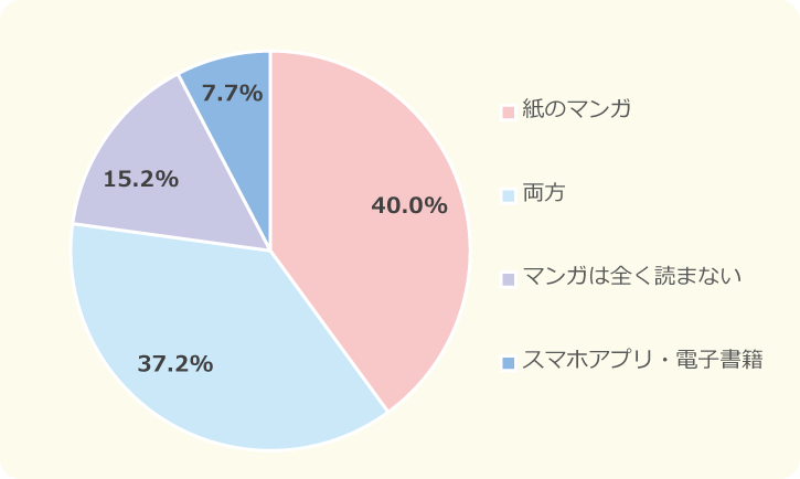 小学生のほぼ半数は、紙でマンガを読んでいるんだね!紙のマンガとあわせて電子書籍を利用する人も、31.6%いるようでした。中学生になると紙のマンガだけを読んでいる人は小学生にくらべて少なく、電子書籍や両方使っているという人の割合がふえました。紙で読みたいけどふえていく一方なので、その点電子書籍は