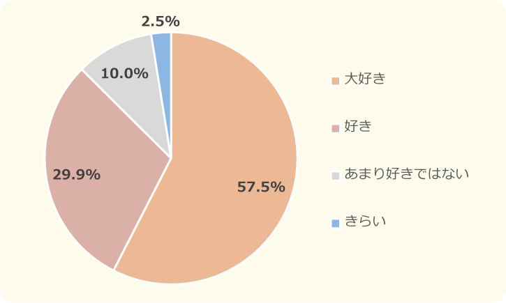57.5%が「大好き」と回答していたよ!。「大好き」と「好き」を合わせると、87%以上の人たちがマンガ以外の本も好きなんだね~!これは意外な結果でした!
