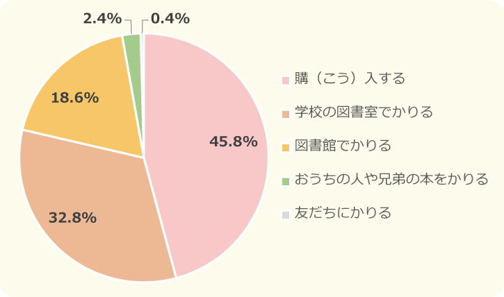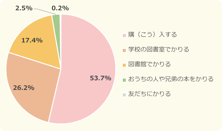 小中学生ともに、1位は「購入する」、2位が「学校の図書館でかりる」、3位は「図書館でかりる」でした。だけど、「購入する」を選んだ小学生が42.4%なのに対して、中学生では53.7%が紙の本を購入して読んでいるという結果に!また、中学生は小学生にくらべて「図書館でかりる」人が少なく、本を購入して読む人が多いことがわかったよ。キッズスタッフはよく図書館に本をかりにいっているよ~!