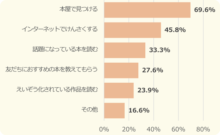 「本屋で見つける」人が最多でした!続いて「インターネットでけんさくする」だったよ。その他には、「好きなYouTuberから